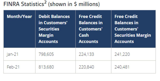 最近几周,随着股市飙升至新高,投资者对券商的保证金债务表示担忧,2月底保证金债务为8130亿美元,为历史最高水平。但人们往往忽略了这样一个事实:保证金债务总是随着股价的上升而上升。