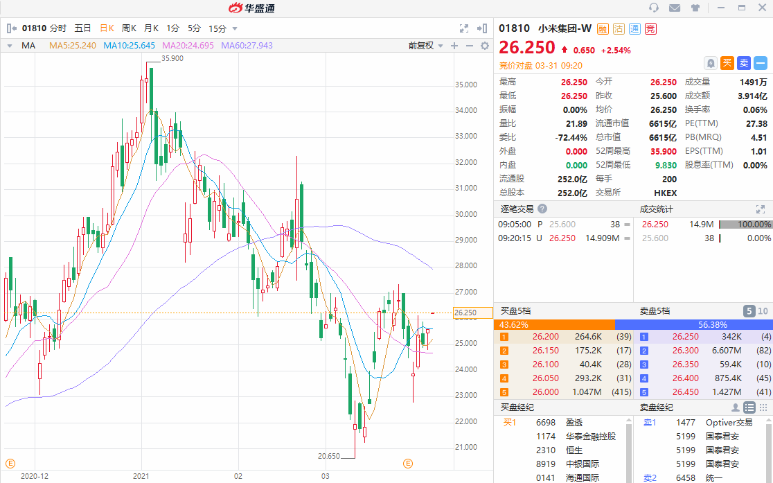 华盛资讯3月31日消息,小米集团于昨日正式公告称,公司智能电动汽车业务立项。受消息影响,小米今日跳空高开涨2.54%,现报26.25港元,最新总市值为6615亿港元。