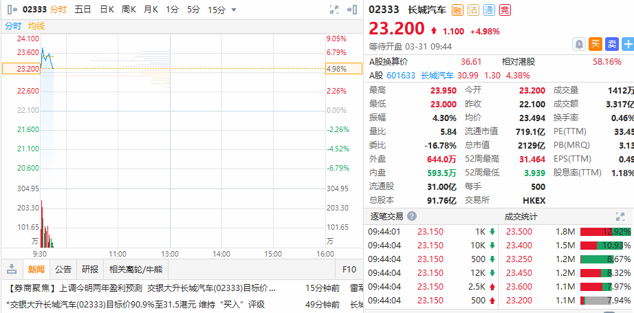 华盛资讯3月31日讯,长城汽车早盘涨7.48%。截至发稿,长城汽车涨4.98%,现报23.20港元,成交额达到3.32亿港元,当前市值约为2129亿港元。