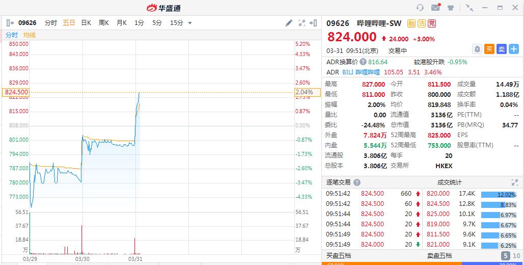 华盛资讯3月31日消息,哔哩哔哩将于2021年4月14日收市后被纳入恒生综合指数和恒生互联网科技业指数,受此消息影响,哔哩哔哩早盘拉升走高。截止发稿,现报每股824港元(发行价为808港元),总市值3136亿港元。