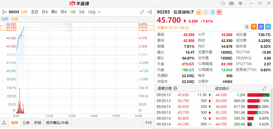 华盛资讯3月31日消息,早盘比亚迪电子直线拉升。截止发稿,比亚迪电子上涨7.91%,现报45.7港元每股,总市值1030亿港元。