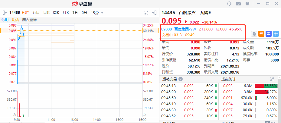 相关窝轮方面,百度法兴一九购E大涨30.14%,成交额103.5万港元,其行使价为328.88港元,2021年9月23日到期,接货比为12.21%。