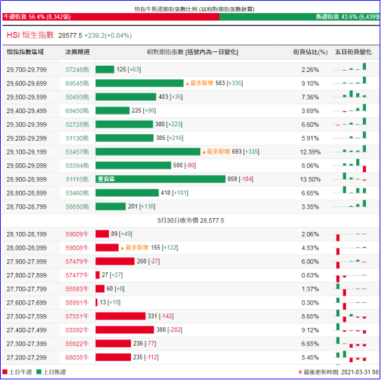 街货分布方面,至周二,恒指贴价牛证街货有所上升,在收回价27700点至28200点之间,累计相当约591张期指合约;恒指熊证街货相对集中,在收回价28700点至29200点之间,累计相当约2671张期指合约。