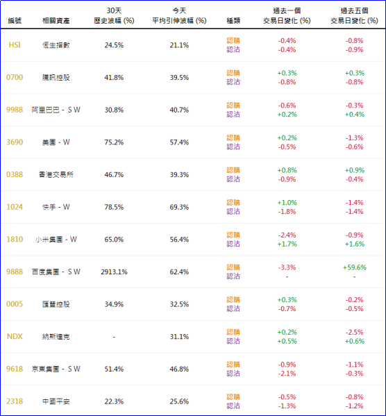 周二恒指相关权证的平均引伸波幅约21.1%,按日小幅下降。个股方面,腾讯、港交所、快手相关认购证的引伸波幅按日调升,其相关认沽证的引伸波幅则按日下降;小米、百度、京东、阿里相关认购证的引伸波幅按日有明显下降。