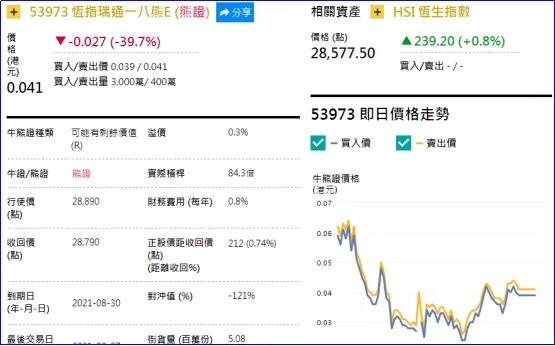 2、看错方向:恒指瑞通一八熊(53973.HK),周二大跌39.71%。
