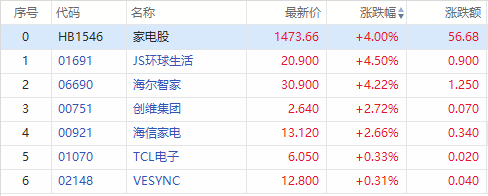 华盛资讯3月31日消息,家电股午后持续攀升,其成分股,JS环球生活绩前涨4.5%,海尔智家发布财报后涨4.22%,创维集团、海信家电皆涨超2%。