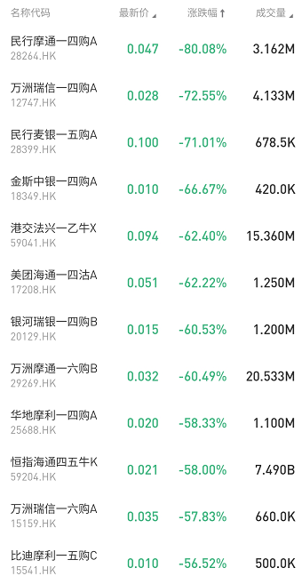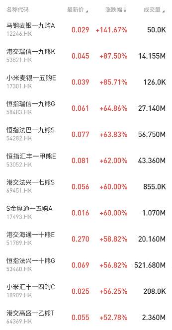 马钢麦银一九购A涨141.67%占据涨幅榜第一,但成交额不大。其次是港交瑞信一九熊K涨87.5%、小米麦银一五购E涨85.71%。