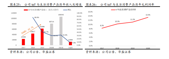 除了手机,小米在AIoT平台也处于领先地位,手机+AIoT已成为公司战略。小米IoT平台的收入在2019年就已经超过500亿大关,IoT平台连接的智能设备已超过3亿台,毛利率也逐年提高。未来随着行业规模的不断扩展,华为公司预计到2025年,智能设备将升至1000亿台以上,这说明小米的IoT平台还有巨大的利润空间。在汽车行业电动化、智能化、互联化的前提下,小米在IoT积累的技术优势也有利于更好地提升汽车驾驶体验。