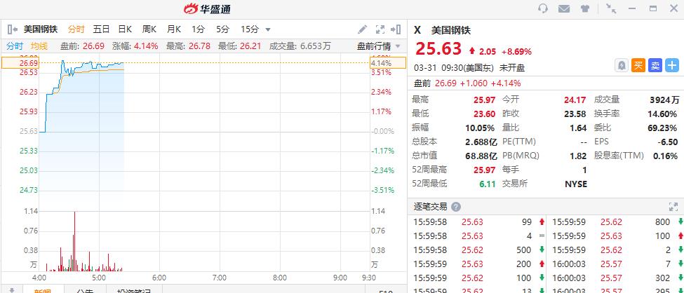 华盛资讯3月31日讯,美股盘前,美国钢铁(X.N)涨4.1%,昨日收涨8.6%,据悉美国总统拜登将宣布基础建设的6500亿美元计划。