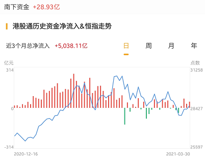 南下资金今日净流入港股高达28.93亿港元,周二为净流入超46亿港元。