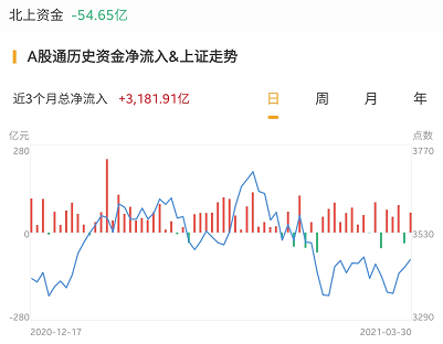 北上资金今日净流出54.65亿元,周二净流入超63亿元。