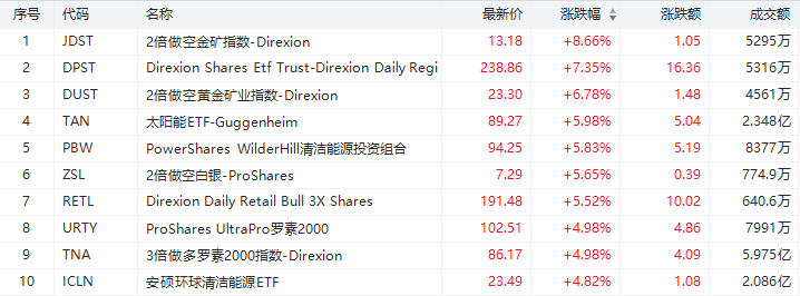 美股上个交易日涨幅前十的ETF