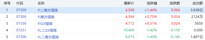 受盘面影响,今日南方两倍看空恒指上涨1.44%,成交额3.638亿港元,成交额居前;中金金瑞中网-R收涨2.25%,涨幅居前。