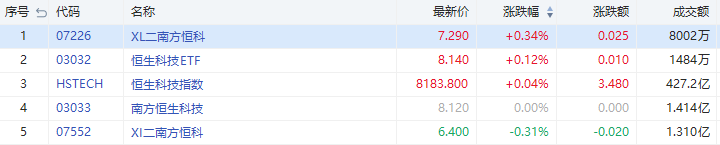 今日恒生科技指数收涨0.04%,其中南方两倍做多恒科收涨0.34%,成交8002万港元;南方两倍做空恒科收跌0.31%,成交1.31亿港元。