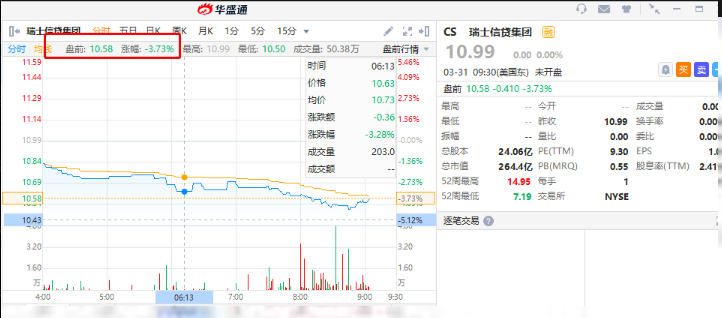 华盛资讯3月31日讯,美股盘前,瑞士信贷(CS.N)跌幅扩大近4%。
