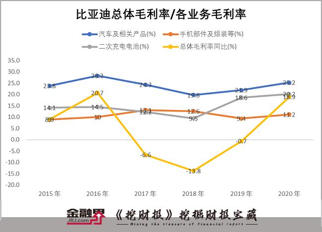 财报显示,比亚迪2020年总体毛利率19.4%,同比增长18.9%。其中,二次充电电池业务毛利率为20.16%;手机部件及组装业务毛利率仅为11.2%;而汽车业务毛利率则高达25.2%成为拉动比亚迪利润增长的核心动力。