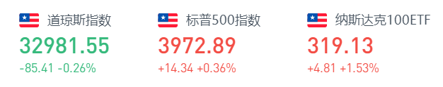 周三收盘,道琼斯指数跌85.41点,跌幅0.26%,报32981.55点;标普500指数涨14.34点,涨幅0.36%,报3972.89点;纳斯达克综合指数涨201.48点,涨幅1.54%,报13246.87点。