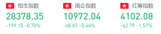 周三收盘,恒生指数跌199.15点,报28378.35点。国企指数跌0.44%,报10972.04点,红筹指数跌1.51%,报4102.08点。