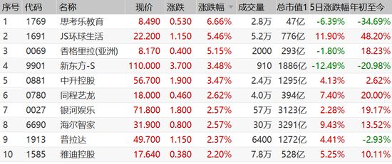 消费股走高,思考乐教育超跌后反弹大涨6.66%,新东方涨超3%,海尔智家、银河娱乐、同程艺龙等涨超2%。