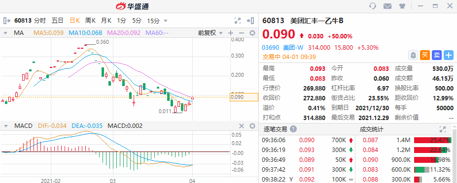 相关窝轮方面,美团汇丰一乙牛B大涨50%,成交额46.15万港元,其行使价为269.88港元,2021年12月30日到期,接货比23.55%。
