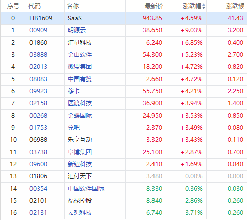 华盛资讯4月1日消息,SaaS股今日又见回升,明源云大涨超9%,汇量科技涨超6%,金山软件涨超5%,微盟集团、中国有赞、移卡涨超4%,医渡科技、金蝶国际涨超3%。