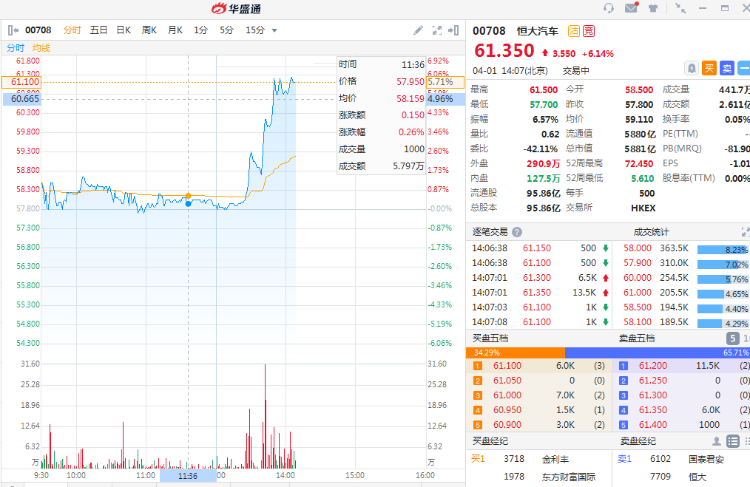 4月1日消息,恒大汽车午后涨幅扩大至6%,恒大董事局主席许家印在中国恒大2020年度业绩发布会上表示,恒大汽车计划今年四季度试生产,明年实现大量交付。