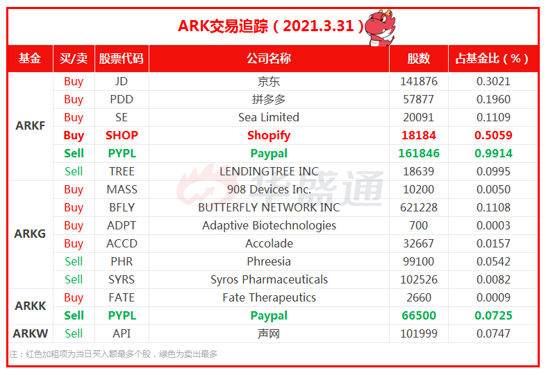 昨日为3月最后一个交易日,ARK只进行了15笔交易,其中9笔买入。而买入的个股中出现多只电商股,包括中概股京东、拼多多,加拿大电商软件开发商Shopify。
