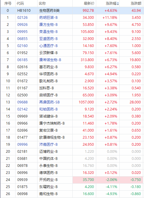华盛资讯4月1日消息,生物医药B类股今日走高,成分股尾盘涨幅持续扩大。截至发稿,药明巨诺涨超11%,康方生物、荣昌生物涨超9%,亚盛医药涨超8%,心通医疗、云顶新耀涨超7%,康希诺生物涨超6%。
