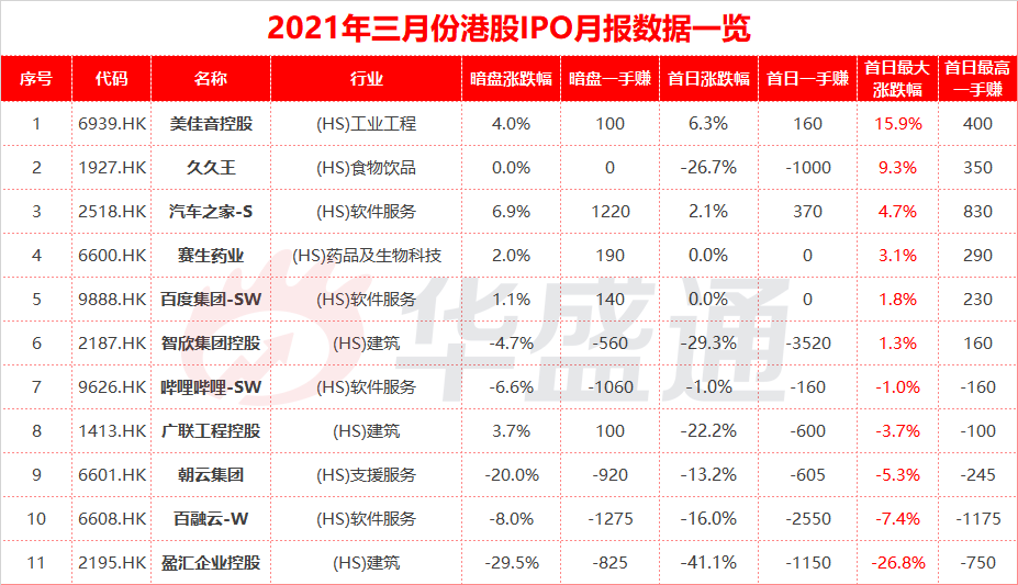 在2021年的3月份,港股共有11家公司挂牌上市,尽管新股数量有所增加但收益上却显得较为“惨淡”。