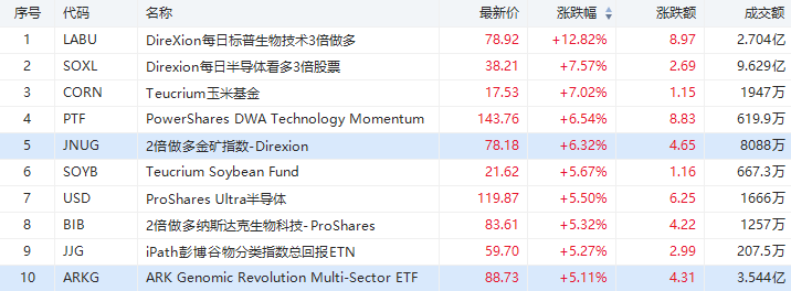 从ETF涨幅榜来看,前期走低的生物技术股反弹,3倍做多标普生物技术的LABU大涨12.82%,成交2.704亿美元。此外,受消息利好刺激,半导体板块走高,3倍做多半导体的SOXL涨近8%,成交达9.629亿美元。有基金经理评论,2021年或是半导体行业大年。