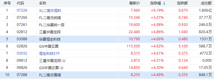 今日港股涨幅居前的ETF有南方两倍做多恒科,高涨9.19%,成交1.606亿港元;三星中国龙网上涨4.86%,成交额达820.4万港元。
