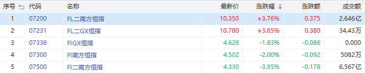 看多恒指的ETF走强,南方两倍看多恒指涨3.76%,成交额2.646亿港元。