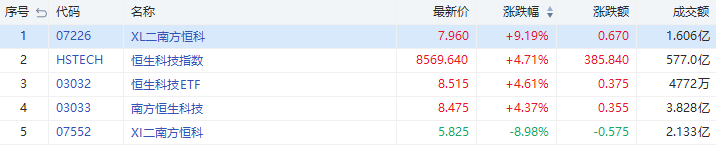 今日恒生科技指数大涨4.71%,其中,南方两倍做多恒科涨9.19%领先;南方恒生科技收涨4.37%,成交3.828亿港元;南方两倍做空恒科大跌8.98%,成交2.133亿港元。