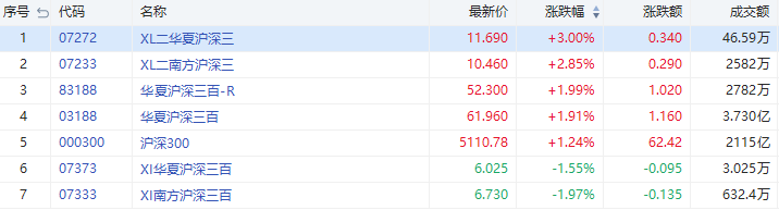今日沪深300指数涨1.24%。其中,华夏沪深三百ETF收涨1.91%,成交额3.730亿港元;南方做空沪深三百跌1.97%,成交632.4万港元。