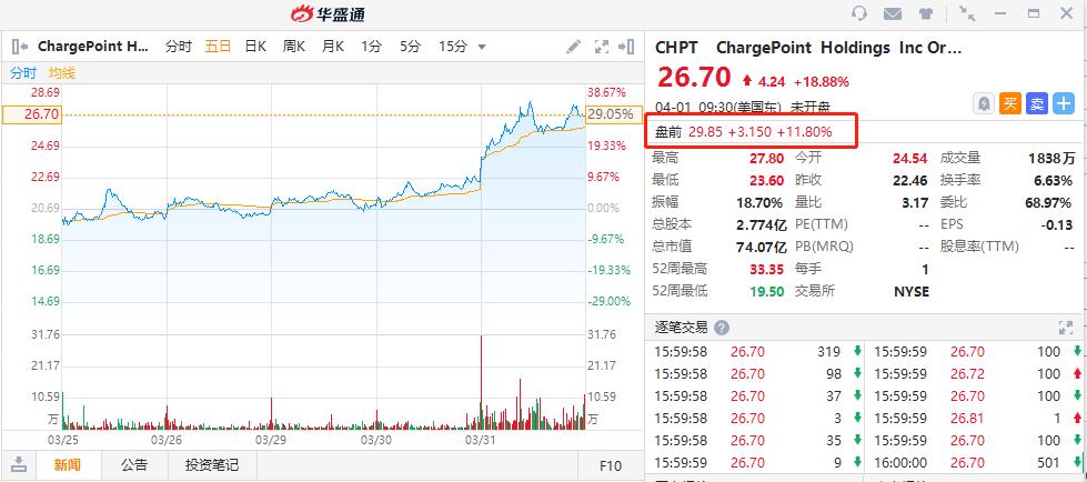 华盛资讯4月1日讯,美股充电桩概念股盘前涨幅扩大,Chargepoint Holdings(CHPT.O)涨超11%,Beam Global(BEEM.O)涨7.5%,Blink Charging(BLNK.O)涨近5%,TPG Pace Beneficial(TPGY.O)涨近4%。