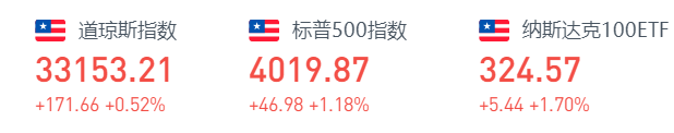 周四收盘,道琼斯指数涨171.66点,涨幅0.52%,报33153.21点;标普500指数涨47.01点,涨幅1.18%,报4019.90点,史上首次站上4000点大关;纳斯达克综合指数涨233.24点,涨幅1.76%,报13480.11点。