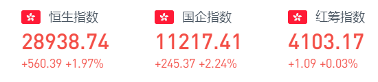 周四收盘,恒生指数涨560.39点,报28938.74点,全日成交额达1782.53亿。国企指数涨2.24%,报11217.41点,红筹指数涨0.03%,报4103.17点。