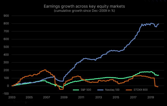从盈利角度来看,从2009年开始最近十年里,纳斯达克100指数成分股的盈利增长水平在欧美主要股指中一骑绝尘。