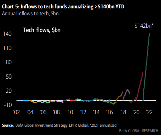 仔细看拜登的刺激计划中对于科技公司的倾斜并不是最重,但科技公司的涨幅确是最高?从美银统计的数据来看,从17年开始每年流入科技基金的资金都在加速,根据年初至今已经流入的资金预判今年的流入总额将达到1420亿美元,比去年多出一倍。