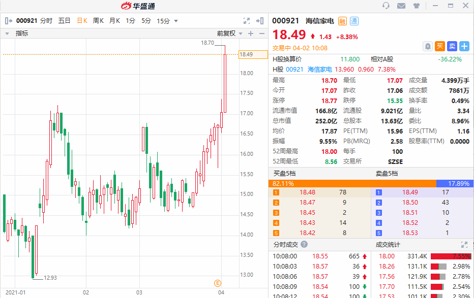 华盛资讯4月2日消息,海信家电A股今日高开高走,盘中获快速拉升逾8%,现报18.49元。值得注意的是海信家电已经连续十个交易日呈上涨趋势,股价刷新自2000年以来新高。