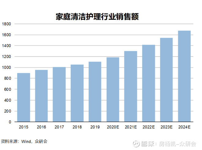 消费升级和健康意识的提升推动市场稳步增长。弗若斯特沙利文报告显示,我国家庭清洁护理行业的市场规模从2015年的900亿元以5.3%的年复合增长率增长至2019年的1108亿元。随着人均可支配收入的不断提升以及疫情带来全民健康意识的增长,预计2024年整个市场规模将达到1677亿元,行业发展空间广阔。