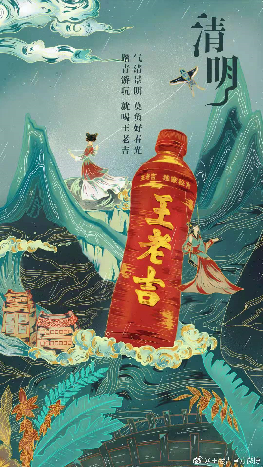 王老吉的主题基本上都围绕着踏青出游、缅怀思故展开,色调以青绿色为主,大方向不会出错,而且海报设计的审美肉眼可见的提高,值得表扬。