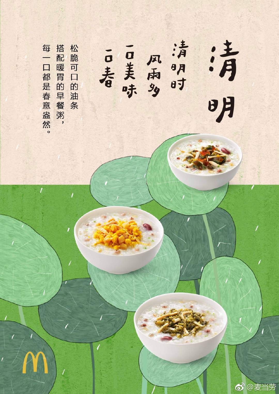 18年是麦咖啡东方全叶茶,“春雨细 香茗品 一口回甘 一口春”;19年是早餐粥,“清明时 风雨多 一口美味 一口春”,都采用“一口xx,一口春”的句式,很符合餐饮品牌的调性。