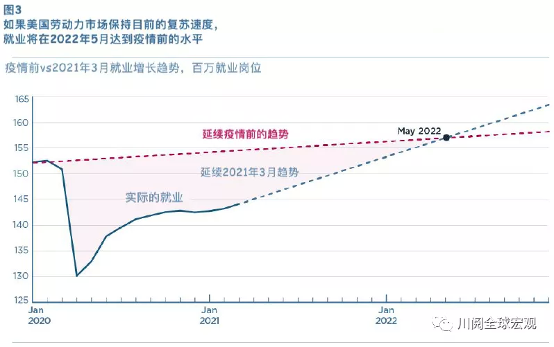 以一般标准衡量,3月的就业增长速度非同寻常,但仍需14个月、直到2022年5月才能使美国劳动力市场回归常态,如图3所示。