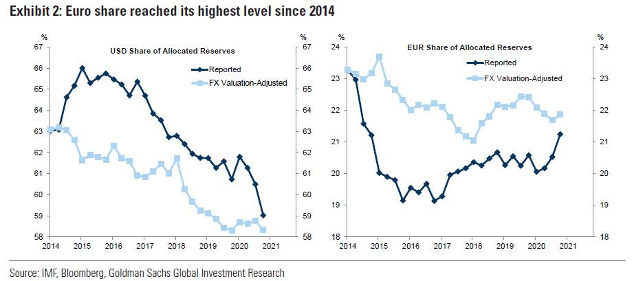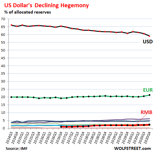 Wolf Street统计显示,2014年以来,美元在官方外储中的占比平均每年下降1%,从66%降至59%。按照这个速度计算,10年内美元的占比将不到50%。
