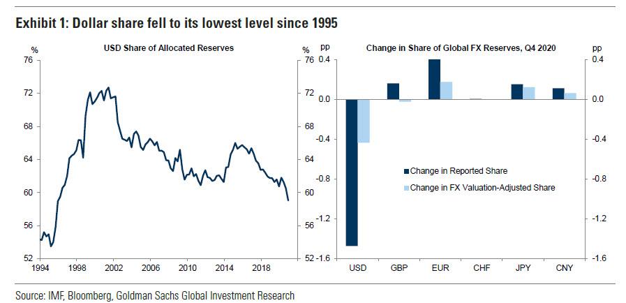 Bannockburn Global首席市场策略师Marc Chandler认为,美元在全球储备中的份额下降主要受到第四季度美元兑大多数货币下滑的推动。去年第四季美元汇率跌4%,是2017年6月以来最差表现。