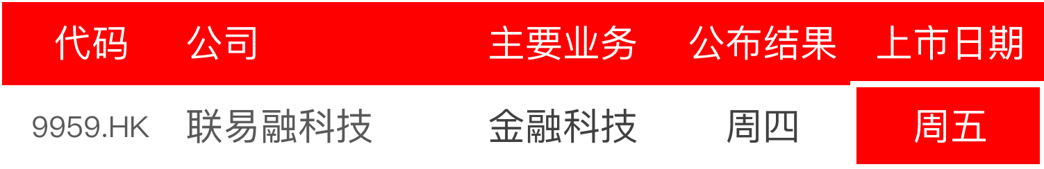 内地的供应链金融科技解决方案提供商联易融(09959)将于下周四公布配售结果,周五正式挂牌,IFR 引述知情人士透露,招股价以接近中间价17.58元定价,集资79.62亿元。