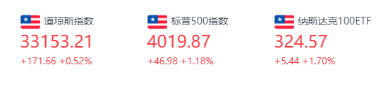 上周四美股收盘,道琼斯指数涨0.52%,报33153.21点;标普500指数涨1.18%,报4019.90点,创出新高;纳斯达克综合指数涨1.76%,报13480.11点。