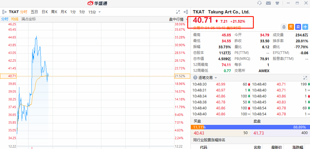 截至发稿,香港大公文化集团Takung Art(TKAT)涨超21%,股价报40.71美元,盘中一度涨超30%。