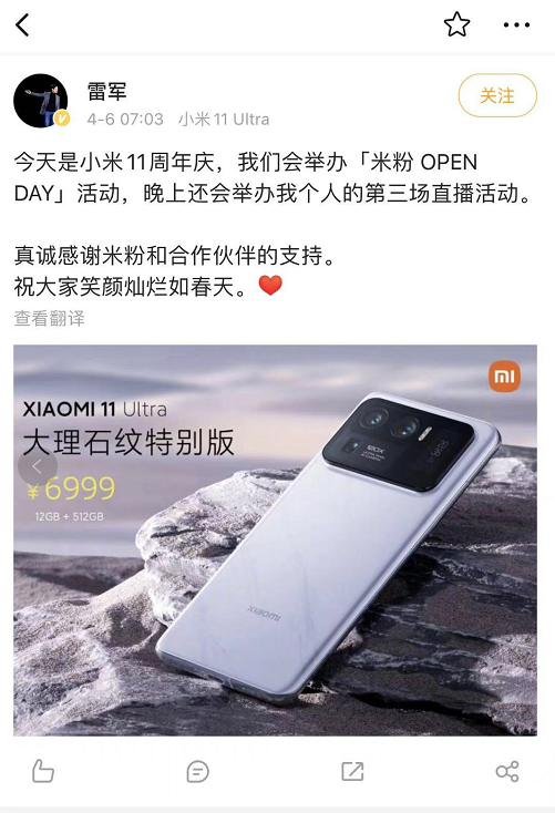 小米集团(01810.HK)董事长兼CEO雷军:今天是小米11周年庆,我们会举办米粉OPEN DAY活动,晚上还会举办我个人的第三场直播活动。